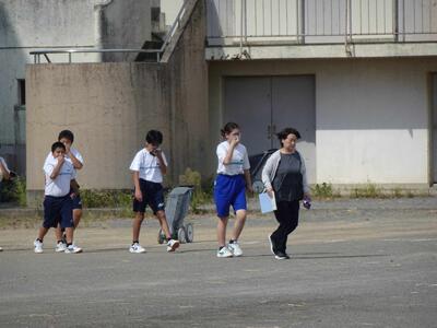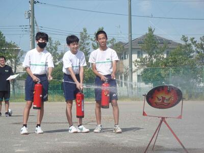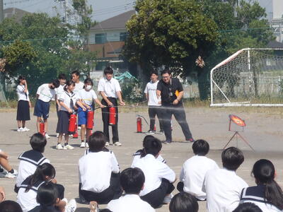 第1校時、火災を想定した防災訓練が実施されました。また、代表生徒による消火器の操作演習が行われました。