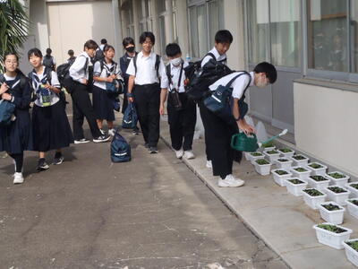 朝、登校時に生徒が小松菜の水やりを行っておりました。