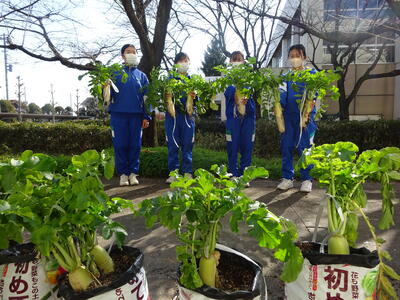 1日(水)昼休み、1年生が技術室前で育てている大根を掘りました。どの大根が大きく育っているかとよく確認しながら「よいしょ!」と。とても立派な大根が掘れました。この大根は明日の家庭科の調理実習での材料となります。お楽しみにしていてください。