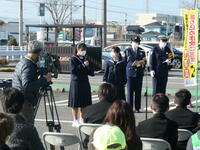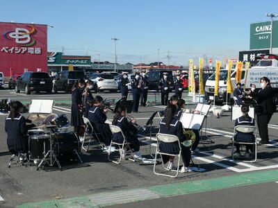 12月4日(日)カインズ行田店で行われた交通事故防止運動決起集会に、本校吹奏楽部と新生徒会本部役員が参加し、オープニングで吹奏楽部が演奏を披露しました。交通安全広報アンバサダーに就任した、県警の元警察官でテレビのコメンテーターとしても活躍する佐々木成三さんに、吹奏楽部員、新生徒会本部役員が質問するという場面もありました。その後、佐々木さんと共に啓発品を一般客に配布し、本部役員は椅子の片付けまで手伝いました。とても貴重な体験をさせていただきました。