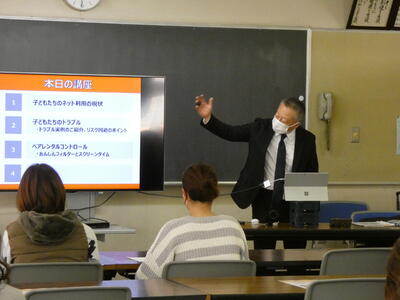 16日(金)13:20より本校会議室において、『家庭教育学級』が行われました。今回はKDDIから講師をお招きし、「スマホ・ケータイ安全教室」ということで、SNS等でのトラブル、スマホ依存等について、例を交えながら生徒が安心・安全にスマホを使えるような、様々な注意点、解決方法等をとても上手に教えていただきました。参加した保護者の方々も納得しながら真剣に聞き入っていました。講師の先生、参加していただいた保護者の皆様、PTA役員の皆様、ありがとうございました。
