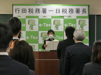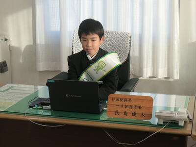 「中学生の税についての作文」で、“関東信越国税局長賞”を授賞した本校2年生男子生徒が副賞として、20日に“一日行田税務署長”体験をさせていただきました。まず委嘱状を交付していただき、本物の所長様との名刺交換、署内視察、署長訓示(作文朗読)、スマホ申告・納税体験、取材対応等の業務をしっかりこなしていました。とてもよい体験をさせていただきました。ありがとうございました。