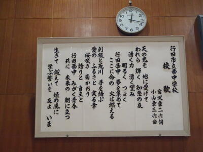 本校では、卒業式に向けて環境整備を行っております。校舎前の南側と東側に大きな樹木が数本あり、太陽の光がさえぎられたり、隣接している民家の迷惑になっているなど、改善しなけれななりませんでした。今回、卒業式までの環境整備において樹木の伐採を行いました(1枚目の画像)。そして、会場である体育館の放送設備の不具合があり、業者の方に調整、直していただきました。さらに、高所にある校歌の歌詞が一部剥がれていたり、破損している箇所があり、これも業者の方に直していただきました(2枚目の画像)。