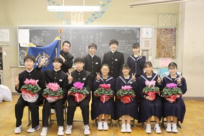 新生徒会誕生!! 投稿: 西中学校 (2022/12/05) 生徒会引継式のあと、生徒会室にて旧本部役員さんに感謝を込めて鉢植えの贈呈を行いました。引継式も終わり、少しホッとした様子で笑顔も見られました。新生徒会のみなさんは、『これから頑張るぞ!』という意気込みが感じられました。これからも、西中生全員で学校を盛り上げていきましょう!! 新旧生徒会本部役員メンバ- 旧生徒会本部役員 新生徒会本部役員 Tweet -