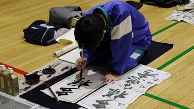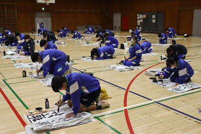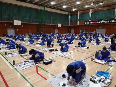 1月9日(金)学年ごとに体育館で書きぞめ競書会が行われました。画像は、2年生、3年生のようすです。