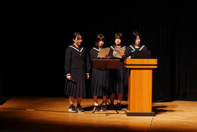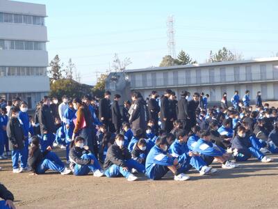 そして、3年生代表からは、3学期が始まったばかりではるが、卒業が間近であり、中学校3年間、義務教育9年間の締めくくりとして勉強面でも生活面でも世話になった方への感謝を忘れずに過ごしたい。そして、母から目標は高くもち、乗り越えられなくてもその過程に大きな意義があることを教えられたエピソードを紹介。これまで周囲の方の支えがあったのでみんなでよい卒業式を向けたい。さらに、受験は団体戦。互いに励ましたい。